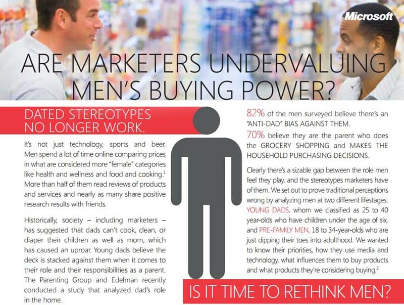 I’ve long believed that family shopping decisions are primarily made by women, and apparently that used to be true. Microsoft has created the following infographic based on surveys and studies from Men’s Health magazine, Edelman, Nielsen and their own joint study with Ipsos Media that should give you food for thought.