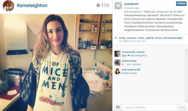 Highlighting important dates in literary history in the form of author and book quotes are our best performers. Asking our fans to share what they are currently reading always guarantees high engagement. And we love regramming photos on Instagram of Out of Print fans wearing our apparel and accessories. [Gossip Girl‘s Leighton Meester pictured here and on Instagram in her Out of Print T-shirt.]