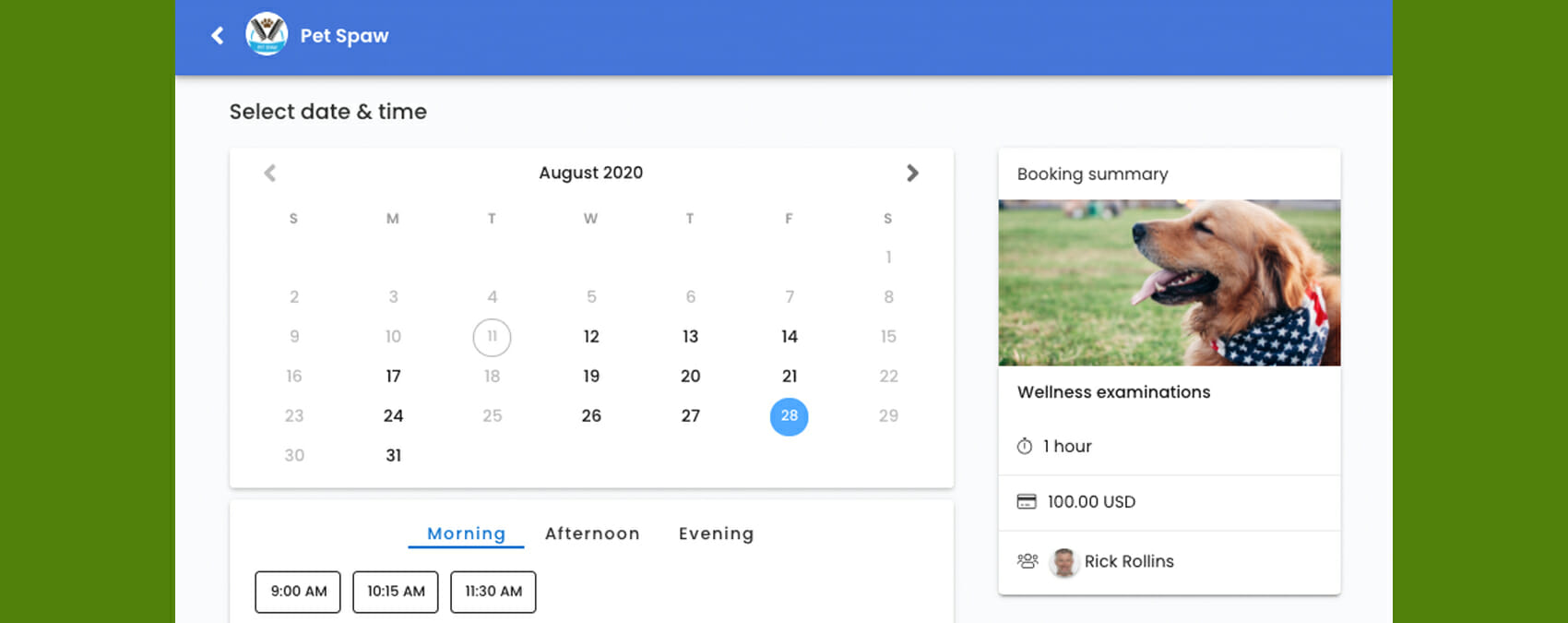 Your customers can still choose the staff member they wish to schedule with. As they go through the scheduling process, the service price, photo and other details will remain on the screen. All of these elements have a new, modern look to them.