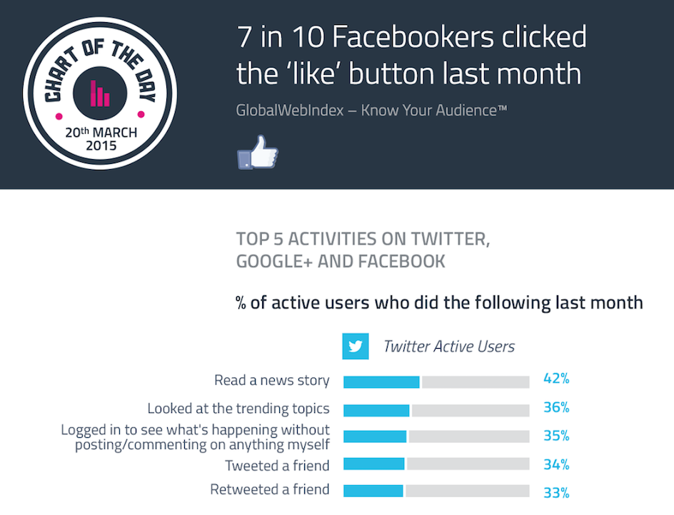 - 70% of active Facebook users clicked the “like” button last month.