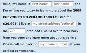 Vast.com, an automobile and real estate listing website, tested this type of form on their site and experienced an increased conversion rate of 25-40% across the board. Here’s a shot of Vast.com’s Contact Dealer form, before and after they implemented the Mad Libs style.