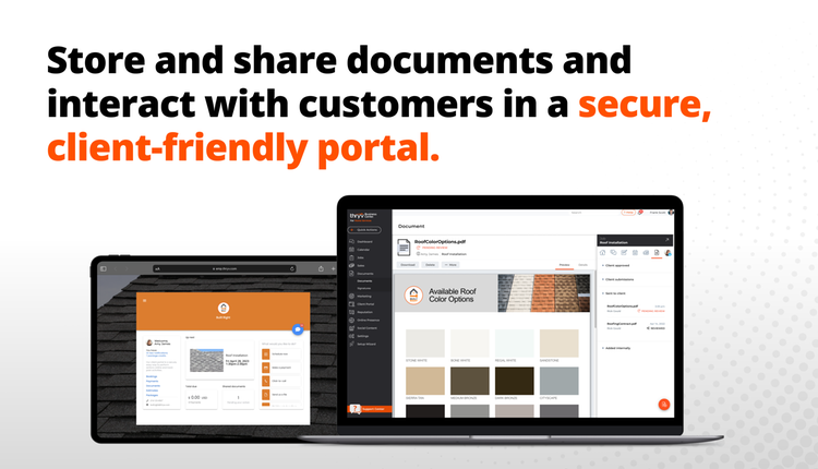 - Documents & Storage – Store documents, images, and files for your different jobs, accounts, customers, and more across your business. Share multiple images, files or documents that your clients can access, review, or approve via their secure Client Portal.
